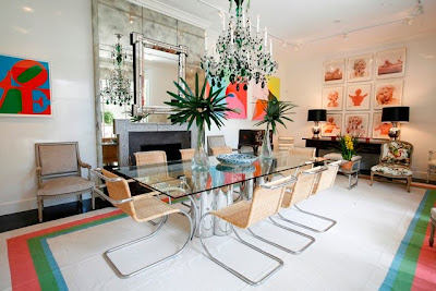 How fabulous is that fretwork fireplace surround? I also like the antique mirror set against the antiqued mirror. Very clever. I'd love to host a dinner party here.